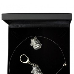 Magnificent quality handcrafted product from list Keyrings associated with dog breed Schnauzer Material:Based on zinc and aluminium.Silver plated.Genuine leather thong. Dimensions:Pendant: 4,7+4,5x4,2cm (1,9+1,8x1,7")Available thong lengths: 40, 50, 60, 70 cm Great idea for a gift! Precise elements handmade by one of the best Polish artists! Made only in Poland!
